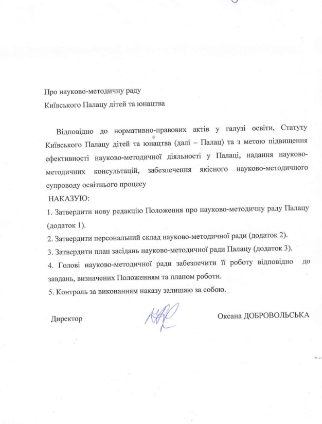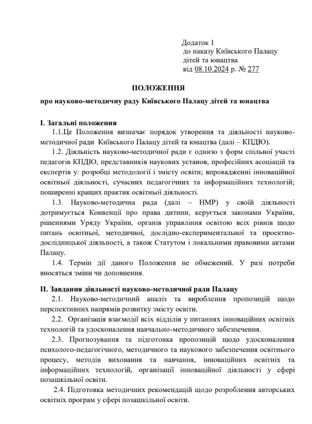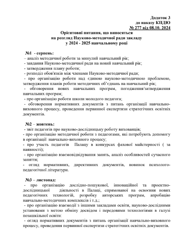Наказ «Про науково-методичну раду Київського Палацу дітей та юнацтва» Положення про науково-методичну раду Київського Палацу дітей та юнацтва Орієнтовні питання, що виносяться на розгляд науково-методичної ради закладу в 2024-2025 навчальному році Персональний складнауково-методичної радиКиївського Палацу дітей та юнацтва Презентація засідання НМР